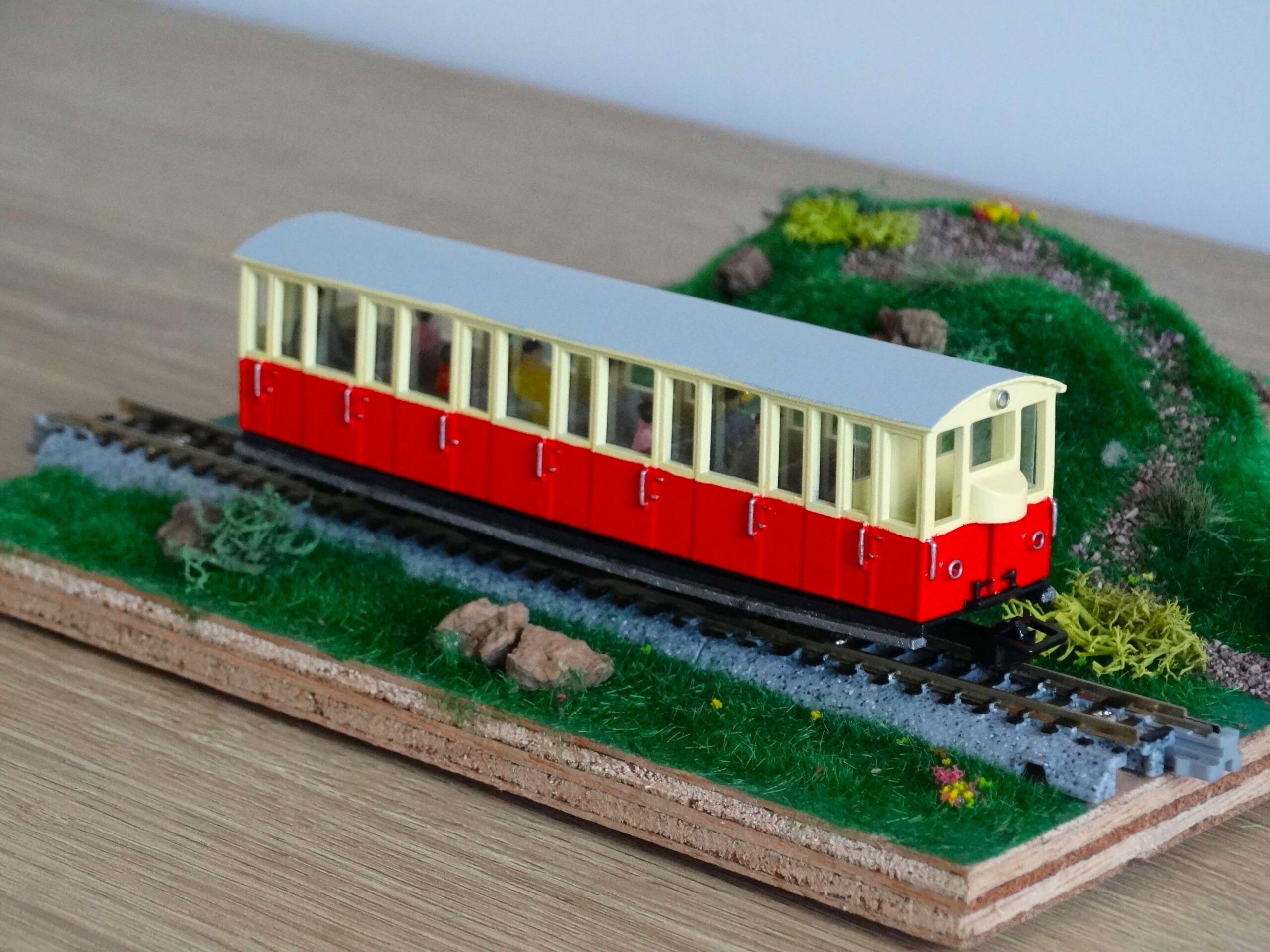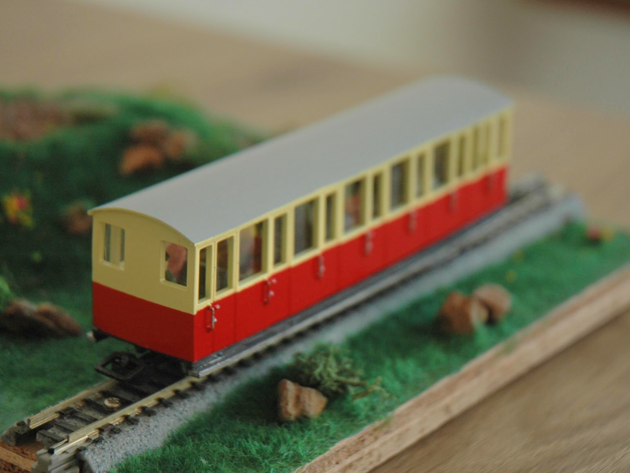 Voiture de voyageurs pour voie étroite époque V modèle B41. Inspiré par les chemin de fer alpins, ce modèle convient pour une utilisation à l’échelle HOe ou HOn30.